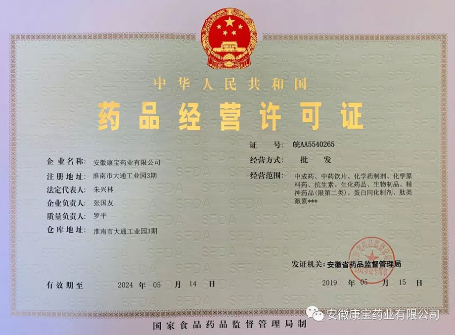 2019年5月23日,安徽省藥品監(jiān)督管理局正式將重新認(rèn)證后的《藥品經(jīng)營(yíng)質(zhì)量管理規(guī)范認(rèn)證證書》、《藥品經(jīng)營(yíng)許可證》頒發(fā)給康寶藥業(yè),標(biāo)志著我公司順利通過(guò)此次GSP認(rèn)證檢查。